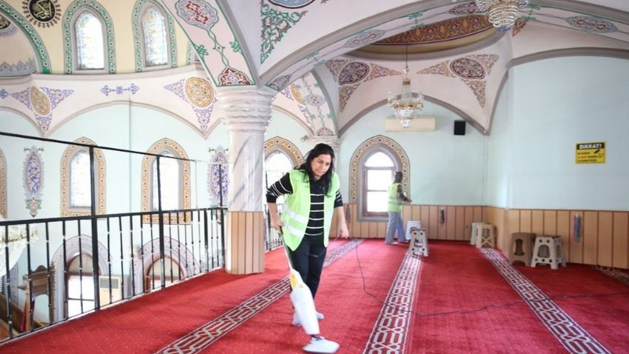 Ayakkabılıklar, abdesthaneler ve tuvaletler hijyen kurallarına uygun şekilde dezenfekte edilirken, cami avluları da düzenli hale getiriliyor.