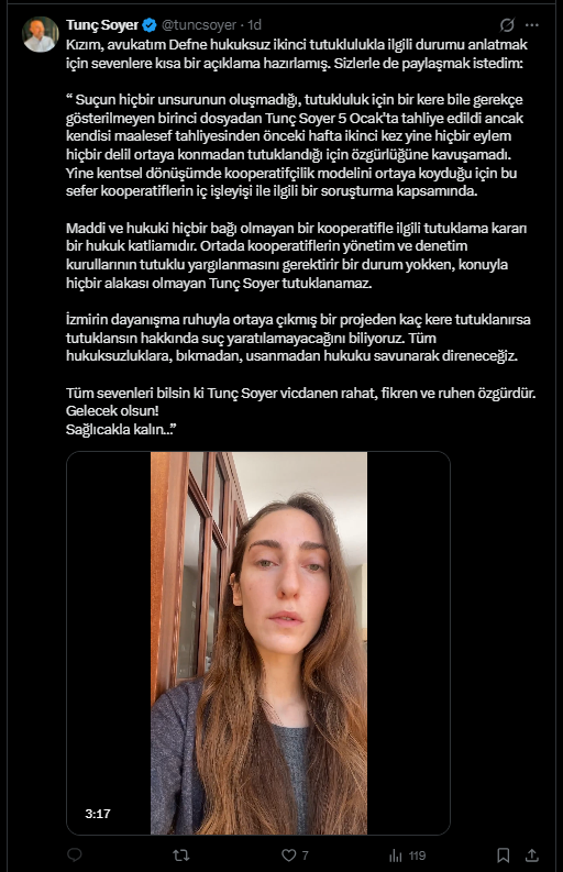 Tunç Soyer’in paylaşımında Defne Soyer’in açıklamalarına yer verildi. Defne Soyer, suçun unsurlarının oluşmadığını ve tutukluluk için gerekçe gösterilmediğini belirterek Tunç Soyer’in 5 Ocak’ta ilk dosyadan tahliye edildiğini ifade etti. Ancak tahliyeden önceki hafta açılan ikinci bir soruşturma kapsamında yeniden tutuklandığı için özgürlüğüne kavuşamadığını ise şu ifadelerle aktardı: "Merhaba ben Tunç Soyer’in kızı aynı zamanda avukatı Defne Soyer. Suçun hiçbir unsurunun oluşmadığı, tutukluluk için bir kere bile gerekçe gösterilmeyen birinci dosyadan Tunç Soyer 5 Ocak’ta tahliye edildi ancak kendisi maalesef tahliyesinden önceki hafta ikinci kez yine hiçbir eylem, hiçbir delil ortaya konmadan tutuklandığı için özgürlüğüne kavuşamadı. Yine kentsel dönüşümde kooperatifçilik modelini ortaya koyduğu için bu sefer kooperatiflerin iç işleyişi ile ilgili bir soruşturma kapsamında."