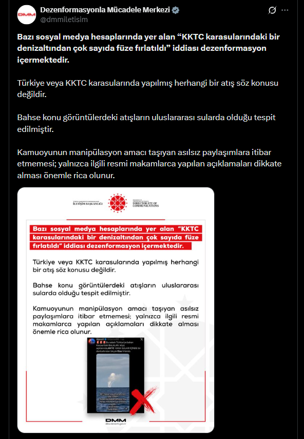 “Bazı sosyal medya hesaplarında yer alan ‘KKTC karasularındaki bir denizaltından çok sayıda füze fırlatıldı' iddiası dezenformasyon içermektedir. Türkiye veya KKTC karasularında yapılmış herhangi bir atış söz konusu değildir. Bahse konu görüntülerdeki atışların uluslararası sularda olduğu tespit edilmiştir. Kamuoyunun manipülasyon amacı taşıyan asılsız paylaşımlara itibar etmemesi; yalnızca ilgili resmi makamlarca yapılan açıklamaları dikkate alması önemle rica olunur."