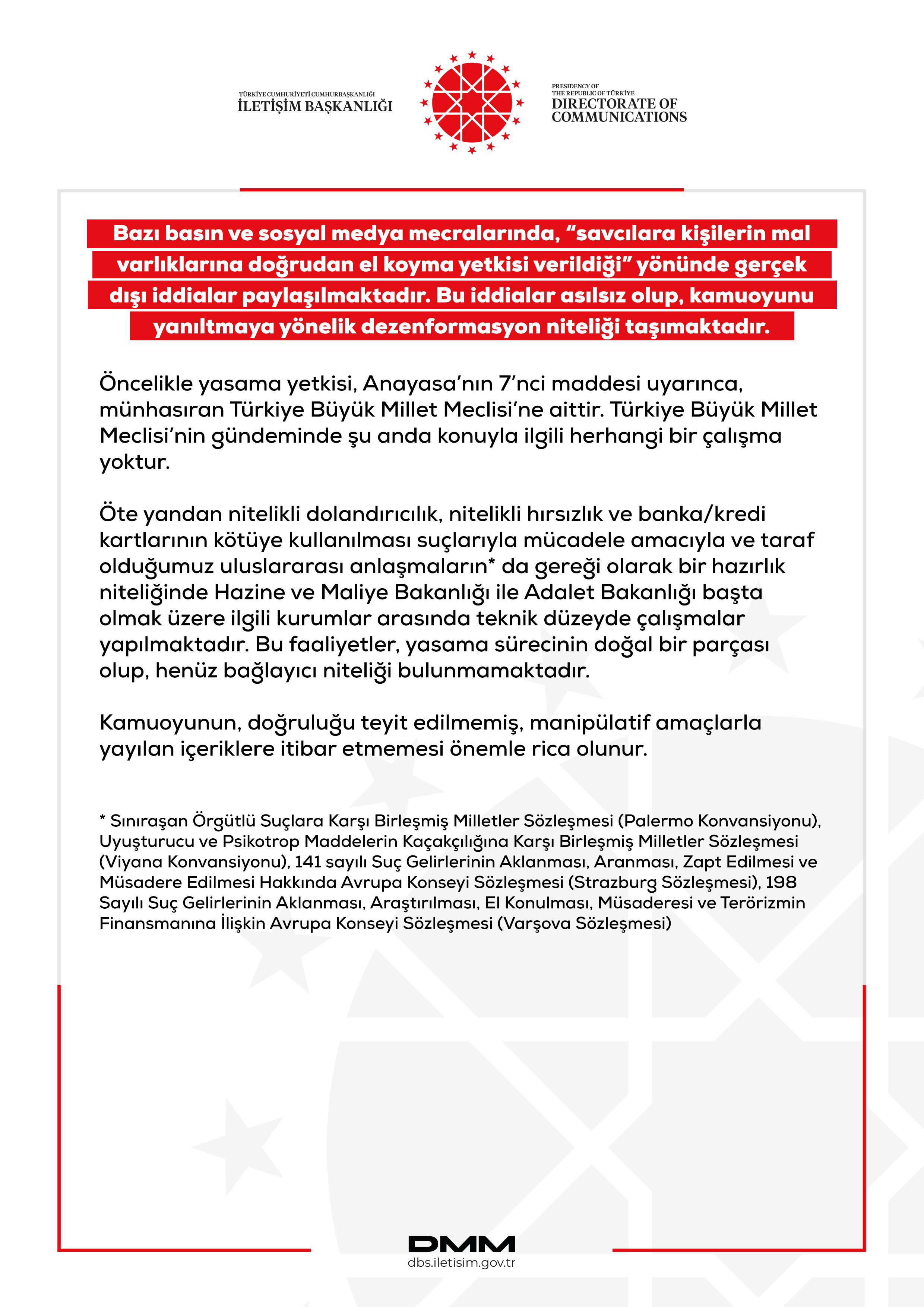 DMM'nin sosyal medya hesabından yapılan açıklamada, "Savcılara kişilerin mal varlıklarına doğrudan el koyma yetkisi verildiği" yönünde gerçek dışı iddialar paylaşılmaktadır. Bu iddialar asılsız olup, kamuoyunu yanıltmaya yönelik dezenformasyon niteliği taşımaktadır." denildi.