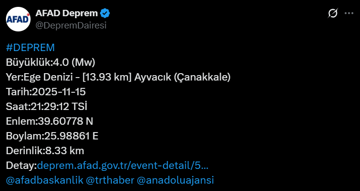 Afet ve Acil Durum Yönetimi Başkanlığı (AFAD), saat 21:29'da Çanakkale’nin Ayvacık ilçesinde 4,0 büyüklüğünde bir deprem meydana geldiğini açıkladı.