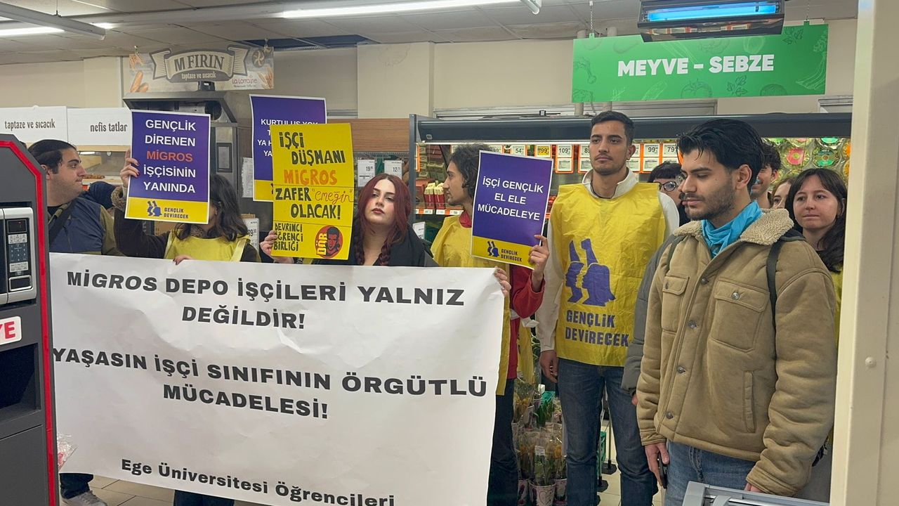 Ege Üniversitesi kampüsü içindeki Migros market içinde düzenlenen eylemde öğrenciler, “Migros depo işçileri yalnız değildir. Yaşasın örgütlü sınıf mücadelemiz” yazılı döviz taşıdı.