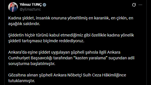 "Kadına şiddet, insanlık onuruna yöneltilmiş en karanlık, en çirkin, en aşağılık saldırıdır. Şiddetin hiçbir türünü kabul etmediğimiz gibi özellikle kadına yönelik şiddeti tartışmasız biçimde reddediyoruz. Ankara’da eşine şiddet uygulayan şüpheli şahısla ilgili Ankara Cumhuriyet Başsavcılığı tarafından “kasten yaralama” suçundan adli soruşturma başlatılmıştır. Gözaltına alınan şüpheli Ankara Nöbetçi Sulh Ceza Hâkimliğince tutuklanmıştır."