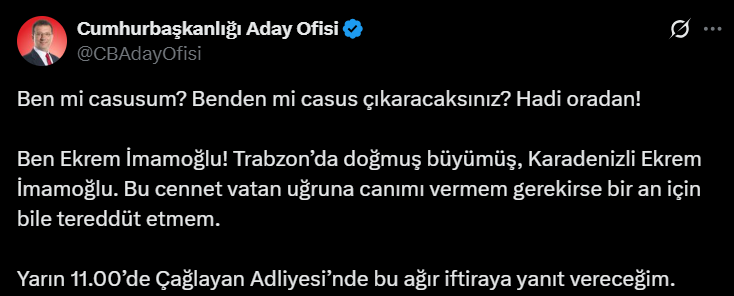 "Ben mi casusum? Benden mi casus çıkaracaksınız? Hadi oradan! Ben Ekrem İmamoğlu! Trabzon’da doğmuş büyümüş, Karadenizli Ekrem İmamoğlu. Bu cennet vatan uğruna canımı vermem gerekirse bir an için bile tereddüt etmem. Yarın 11.00’de Çağlayan Adliyesi’nde bu ağır iftiraya yanıt vereceğim!"