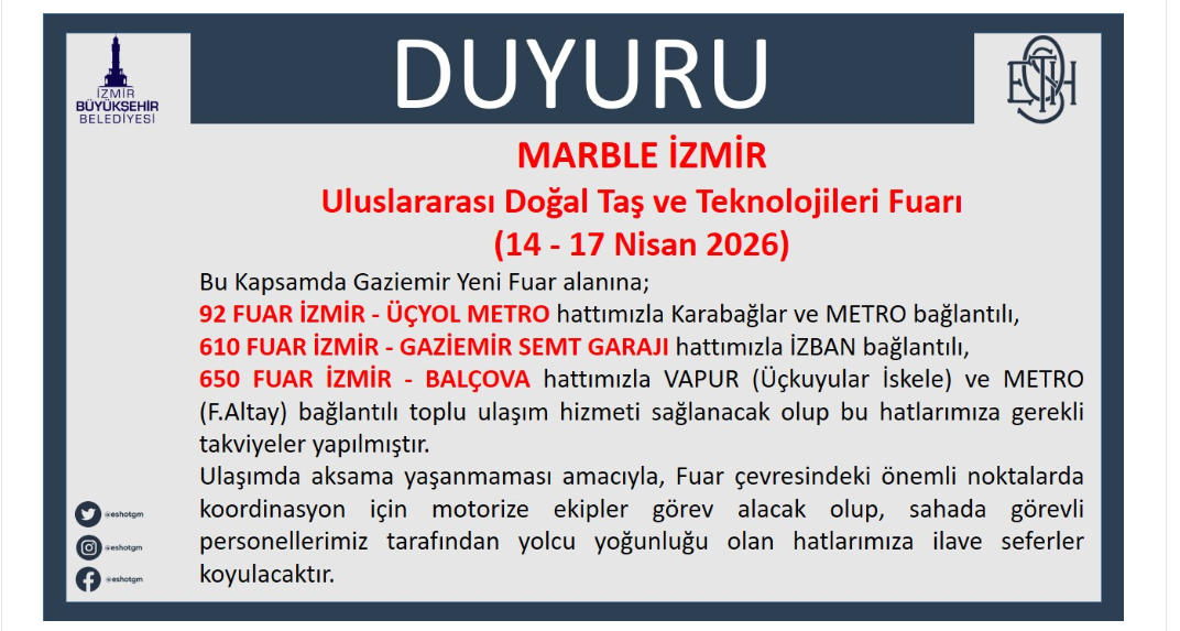 "MARBLE İZMİR Uluslararası Doğal Taş ve Teknolojileri Fuarı (14 - 17 Nisan 2026) Bu Kapsamda Gaziemir Yeni Fuar alanına; 92 FUAR İZMİR - ÜÇYOL METRO hattımızla Karabağlar ve METRO bağlantılı, 610 FUAR İZMİR - GAZİEMİR SEMT GARAJI hattımızla İZBAN bağlantılı, 650 FUAR İZMİR - BALÇOVA hattımızla VAPUR (Üçkuyular İskele) ve METRO (F.Altay) bağlantılı toplu ulaşım hizmeti sağlanacak olup bu hatlarımıza gerekli takviyeler yapılmıştır. Ulaşımda aksama yaşanmaması amacıyla, Fuar çevresindeki önemli noktalarda koordinasyon için motorize ekipler görev alacak olup, sahada görevli personellerimiz tarafından yolcu yoğunluğu olan hatlarımıza ilave seferler koyulacaktır."