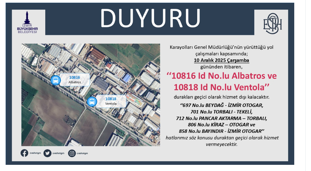 İzmir Büyükşehir Belediyesi ESHOT Genel Müdürlüğü tarafından gerçekleştirilen duyuruda şu ifadeler yer aldı: “Karayolları Genel Müdürlüğü'nün yürüttüğü yol çalışmaları kapsamında 10 Aralık 2025 Çarşamba gününden itibaren "10816 Id No.lu Albatros ve 10818 Id No.lu Ventola" durakları geçici olarak hizmet dışı kalacaktır. "697 No.lu BEYDAĞ - İZMİR OTOGAR, 701 No.lu TORBALI - TEKELİ, 712 No.lu PANCAR AKTARMA - TORBALI, 806 No.lu KİRAZ - OTOGAR ve 858 No.lu BAYINDIR - İZMİR OTOGAR" hatlarımız söz konusu duraktan geçici olarak hizmet vermeyecektir.”