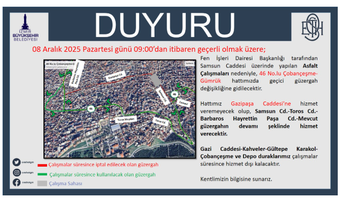 İzmir Büyükşehir Belediyesi ESHOT Genel Müdürlüğü tarafından gerçekleştirilen duyuruda şu ifadeler yer aldı: “08 Aralık 2025 Pazartesi günü 09:00'dan itibaren geçerli olmak üzere; Fen İşleri Dairesi Başkanlığı tarafından Samsun Caddesi üzerinde yapılan Asfalt Çalışmaları nedeniyle, 46 No.lu Çobançeşme- Gümrük hattımızda geçici güzergah değişikliğine gidilecektir.