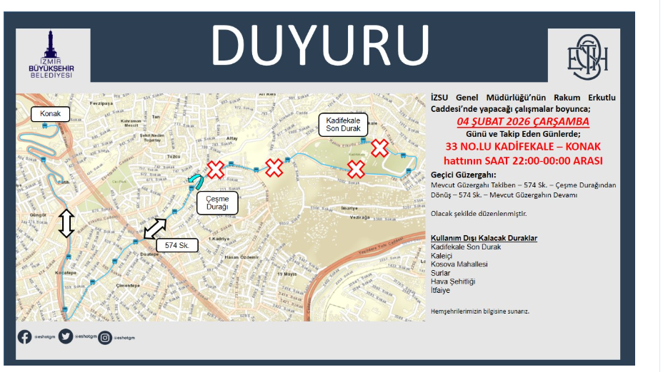 ESHOT Genel Müdürlüğü tarafından yapılan açıklamada şu ifadelere yer verildi: “İZSU Genel Müdürlüğü’nün Rakum Erkutlu Caddesi’nde yapacağı çalışmalar boyunca, 4 Şubat 2026 Çarşamba günü ve takip eden günlerde 33 No’lu Kadifekale–Konak hattının saat 22.00–00.00 arası geçici güzergâhı; mevcut güzergâhı takiben 574 Sokak, Çeşme Durağı’ndan dönüş, 574 Sokak ve mevcut güzergâhın devamı olacak şekilde düzenlenmiştir.