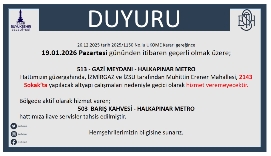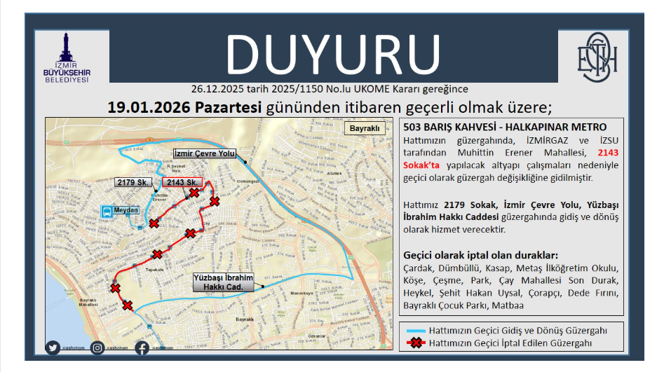 503 Barış Kahvesi – Halkapınar Metro hattı, çalışmalar süresince 2179 Sokak, İzmir Çevre Yolu ve Yüzbaşı İbrahim Hakkı Caddesi güzergâhında gidiş ve dönüş olarak hizmet verecek. Bu süreçte Çardak, Dümbüllü, Kasap, Metaş İlköğretim Okulu, Köşe, Çeşme, Park, Çay Mahallesi Son Durak, Heykel, Şehit Hakan Uysal, Çorapçı, Dede Fırını, Bayraklı Çocuk Parkı ve Matbaa durakları geçici olarak iptal edildi. ESHOT Genel Müdürlüğü tarafından gerçekleştirilen açıklamada şu ifadelere yer verildi “19.01.2026 Pazartesi gününden itibaren geçerli olmak üzere; Bayraklı 503 BARIŞ KAHVESİ - HALKAPINAR METRO Hattımızın güzergahında, İZMİRGAZ ve İZSU tarafından Muhittin Erener Mahallesi, 2143 Sokak'ta yapılacak altyapı çalışmaları nedeniyle geçici olarak güzergah değişikliğine gidilmiştir. Hattımız 2179 Sokak, İzmir Çevre Yolu, Yüzbaşı İbrahim Hakkı Caddesi güzergahında gidiş ve dönüş olarak hizmet verecektir. Geçici olarak iptal olan duraklar: Çardak, Dümbüllü, Kasap, Metaş İlköğretim Okulu, Köşe, Çeşme, Park, Çay Mahallesi Son Durak, Heykel, Şehit Hakan Uysal, Çorapçı, Dede Fırını, Bayraklı Çocuk Parkı, Matbaa”