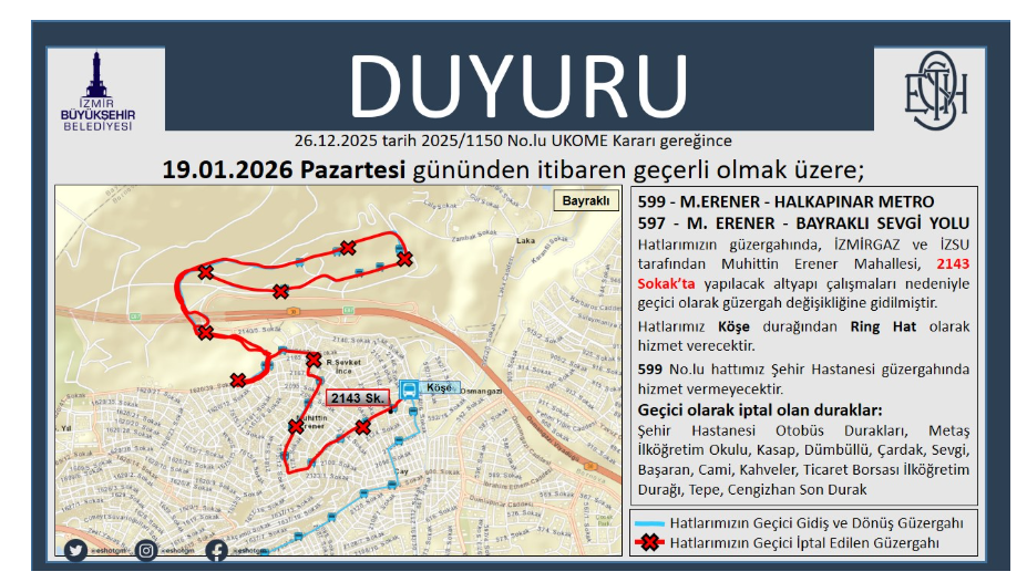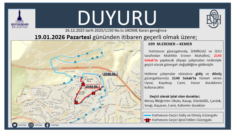 Yapılan duyuruda altyapı çalışmaları nedeniyle 699 M.ERENER- KEMER hattının gidiş ve dönüş güzergahlarında 2140 Sokak üzerinde bulunan Uysal, Kayabaşı Cami ve Huzur duraklarının kullanılacağı bildirildi. Bu kapsamda Metaş İlköğretim Okulu, Kasap, Dümbüllü, Çardak, Sevgi, Başaran, Cami ve Kahveler duraklarının geçici olarak hizmet dışı kalacağı aktarıldı. ESHOT Genel Müdürlüğü tarafından gerçekleştirilen açıklamada şu ifadelere yer verildi “19.01.2026 Pazartesi gününden itibaren geçerli olmak üzere;