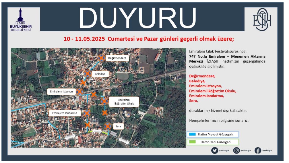 İzmir Büyükşehir Belediyesi’nden yapılan açıklamaya göre, Emiralem’de düzenlenecek Çilek Festivali nedeniyle toplu ulaşımda geçici düzenlemeye gidildi. ESHOT Genel Müdürlüğü tarafından yapılan bilgilendirmede, 747 No'lu Emiralem - Menemen Aktarma Merkezi hattının 10-11 Mayıs 2025 Cumartesi ve Pazar günleri arasında farklı bir güzergah üzerinden çalışacağı açıklandı.