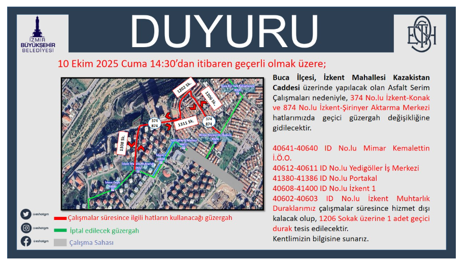 İzmir’deki vatandaşların mağduriyet yaşamaması için 1206 Sokak üzerinde bir adet geçici durak tesis edildiğini duyuran ESHOT şu ifadeleri aktardı: “Buca İlçesi, İzkent Mahallesi Kazakistan Caddesi üzerinde yapılacak olan Asfalt Serim Çalışmaları nedeniyle, 374 No.lu İzkent-Konak ve 874 No.lu İzkent-Şirinyer Aktarma Merkezi hatlarımızda geçici güzergah değişikliğine gidilecektir.