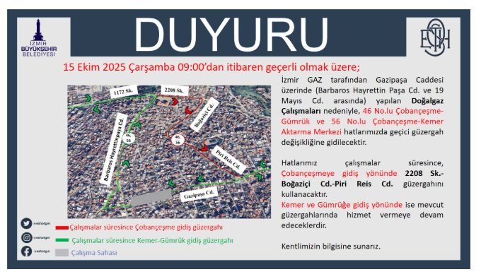 ESHOT Genel Müdürlüğü’nden yapılan yazılı açıklamada şu ifadelere yer verildi: “15 Ekim 2025 Çarşamba 09:00'dan itibaren geçerli olmak üzere; "İzmir GAZ tarafından Gazipaşa Caddesi üzerinde (Barbaros Hayrettin Paşa Cd. ve 19 Mayıs Cd. arasında) yapılan Doğalgaz Çalışmaları nedeniyle, 46 No.lu Çobançeşme- Gümrük ve 56 No.lu Çobançeşme-Kemer Aktarma Merkezi hatlarımızda geçici güzergah değişikliğine gidilecektir.