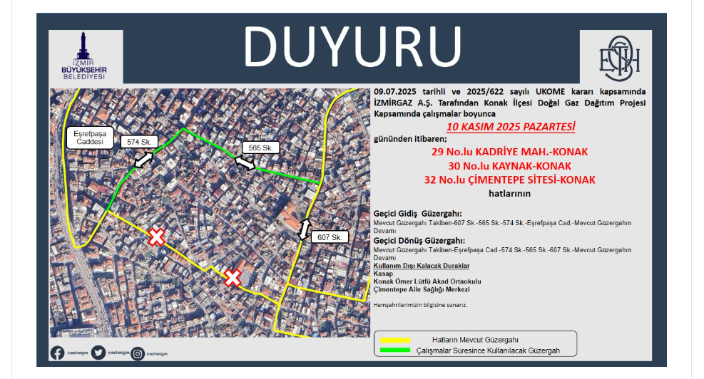 ESHOT Genel Müdürlüğü tarafından yapılan açıklamada şu ifadeler aktarıldı: “İZMİRGAZ A.Ş. tarafından Konak ilçesi Doğal Gaz Dağıtım Projesi kapsamında çalışmalar boyunca 10 Kasım 2025 Pazartesi gününden itibaren; 29 No.lu Kadriye Mah.-Konak, 30 No.lu Kaynak-Konak ve 32 No.lu Çimentepe Sitesi-Konak hatlarının Geçici Gidiş Güzergahı: Mevcut güzergahı takiben 607 Sk.-565 Sk.-574 Sk.-Eşrefpaşa Cad.-mevcut güzergahın devamı Geçici Dönüş Güzergahı: Mevcut güzergahı takiben Eşrefpaşa Cad.-574 Sk.-565 Sk.-607 Sk.-mevcut güzergahın devamı olacak şekilde güncellenmiştir.
