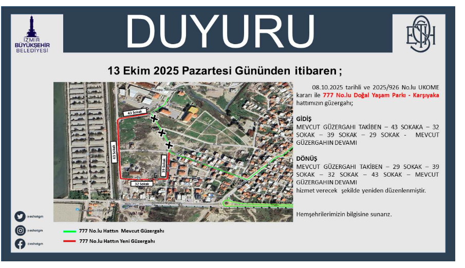 İzmir Büyükşehir Belediyesi ESHOT Genel Müdürlüğü tarafından gerçekleştirilen duyuruda şu ifadelere yer verildi: “13 Ekim 2025 Pazartesi gününden itibaren; 777 No.lu Doğal Yaşam Parkı - Karşıyaka hattımızın güzergahı: