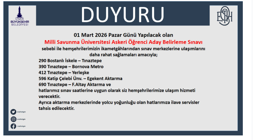 “01 Mart 2026 Pazar Günü Yapılacak olan Milli Savunma Üniversitesi Askeri Öğrenci Aday Belirleme Sınavı sebebi ile hemşehrilerimizin ikametgahlarından sınav merkezlerine ulaşımlarını daha rahat sağlamaları amacıyla; 290 Bostanlı İskele – Tınaztepe, 390 Tınaztepe - Bornova Metro, 412 Tınaztepe – Yerleşke, 596 Katip Çelebi Ünv. - Egekent Aktarma ve 690 Tınaztepe - F.Altay Aktarma hatlarımız sınav saatlerine uygun olarak siz hemşehrilerimize ulaşım hizmeti verecektir. Ayrıca aktarma merkezlerinde yolcu yoğunluğu olan hatlarımıza ilave servisler tahsis edilecektir.”