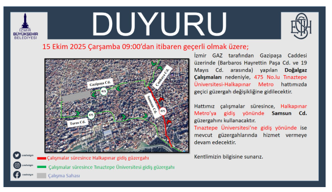 ESHOT Genel Müdürlüğü’nden yapılan yazılı açıklamada şu ifadelere yer verildi: “15 Ekim 2025 Çarşamba 09:00'dan itibaren geçerli olmak üzere; İzmir GAZ tarafından Gazipaşa Caddesi üzerinde (Barbaros Hayrettin Paşa Cd. ve 19 Mayıs Cd. arasında) yapılan Doğalgaz Çalışmaları nedeniyle, 475 No.lu Tınaztepe Üniversitesi-Halkapınar Metro hattımızda geçici güzergah değişikliğine gidilecektir.