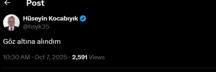 AKP'ye ve Cumhurbaşkanı Recep Tayyip Erdoğan'a yönelik açıklamalarıyla gündem olan eski AKP İzmir Milletvekili Hüseyin Kocabıyık, sosyal medya hesabından yaptığı paylaşımla gözaltına alındığını duyurdu.