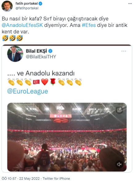 Eski Fox Tv Ana Haber Bülteni sunucusu Fatih Portakal, sosyal medya hesabı üzerinden yaptığı paylaşımda THY CEO'su Bilal Ekşi'yi 'efes' diyememekle suçladı. Ekşi'nin sosyal medya üzerinden "... ve Anadolu kazandı" paylaşımını alıntılayarak yanıtlayan Portakal, birayı çağrıştırdığı için 'Anadolu Efes' diyemediğini, sadece 'Anadolu' yazabildiğini iddia etti. Portakal ayrıca, Efes Antik Kenti'ni de hatırlattı.