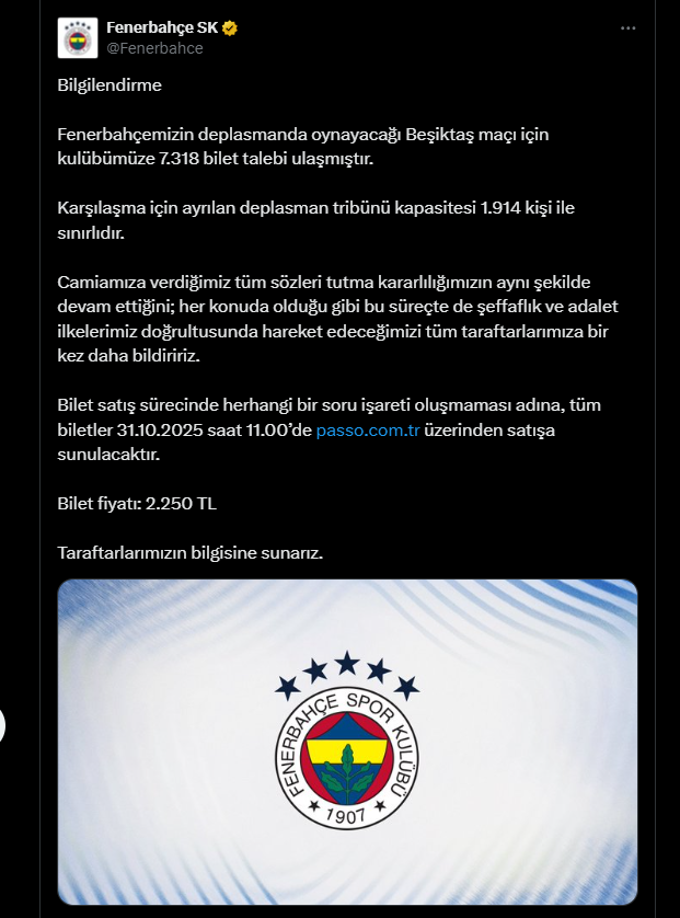 Bilet satış sürecinde herhangi bir soru işareti oluşmaması adına, tüm biletler 31.10.2025 saat 11.00’de http://passo.com.tr üzerinden satışa sunulacaktır. Bilet fiyatı: 2.250 TL Taraftarlarımızın bilgisine sunarız.”