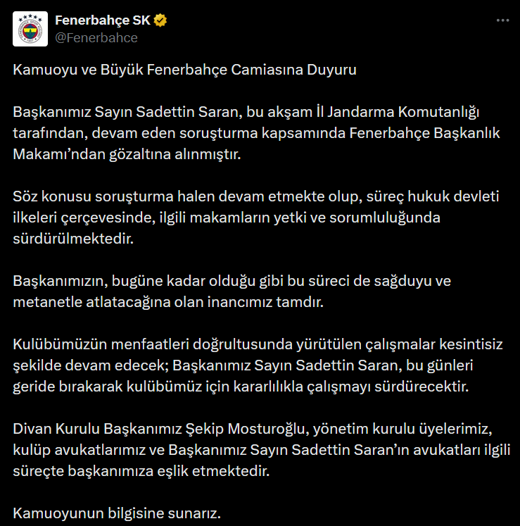 "Kamuoyu ve Büyük Fenerbahçe Camiasına Duyuru Başkanımız Sayın Sadettin Saran, bu akşam İl Jandarma Komutanlığı tarafından, devam eden soruşturma kapsamında Fenerbahçe Başkanlık Makamı’ndan gözaltına alınmıştır. Söz konusu soruşturma halen devam etmekte olup, süreç hukuk devleti ilkeleri çerçevesinde, ilgili makamların yetki ve sorumluluğunda sürdürülmektedir. Başkanımızın, bugüne kadar olduğu gibi bu süreci de sağduyu ve metanetle atlatacağına olan inancımız tamdır. Kulübümüzün menfaatleri doğrultusunda yürütülen çalışmalar kesintisiz şekilde devam edecek; Başkanımız Sayın Sadettin Saran, bu günleri geride bırakarak kulübümüz için kararlılıkla çalışmayı sürdürecektir. Divan Kurulu Başkanımız Şekip Mosturoğlu, yönetim kurulu üyelerimiz, kulüp avukatlarımız ve Başkanımız Sayın Sadettin Saran’ın avukatları ilgili süreçte başkanımıza eşlik etmektedir. Kamuoyunun bilgisine sunarız."