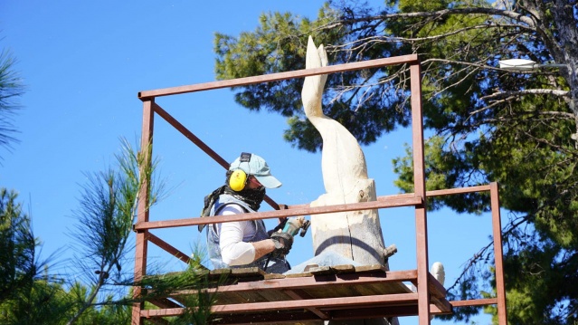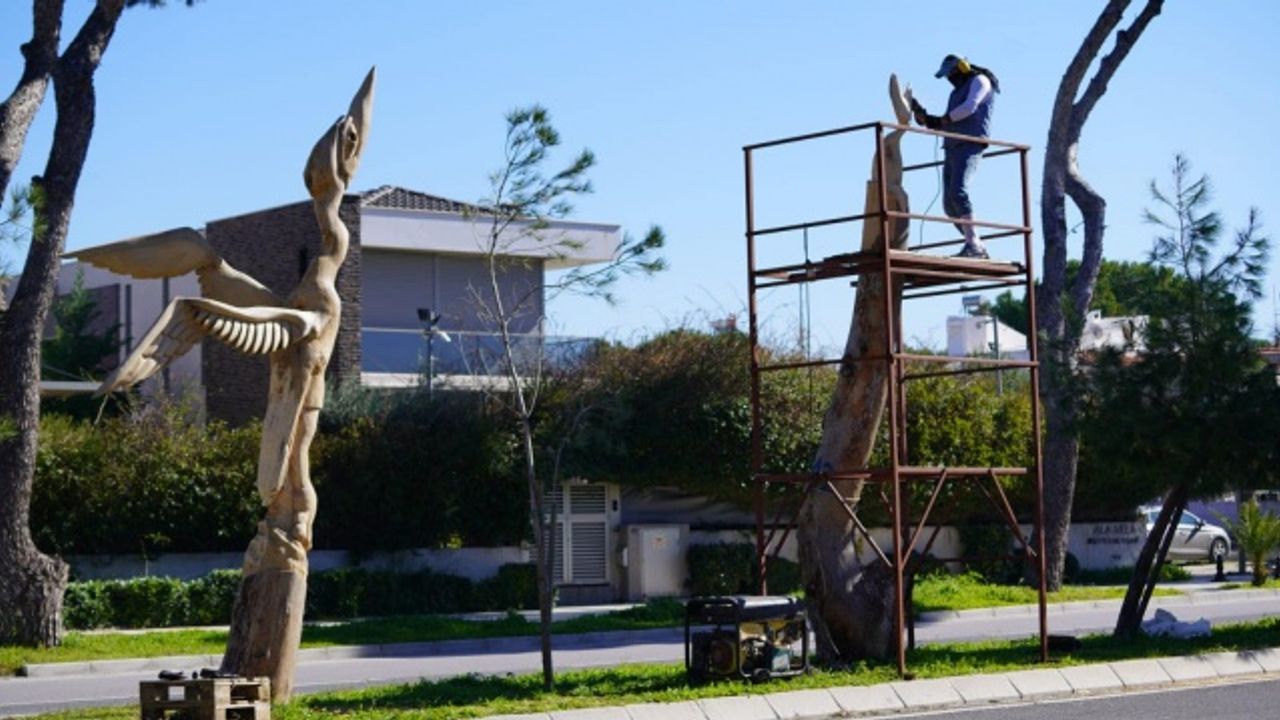 Heykeltraş Onur Canka, Alaçatı Çamlık yolda bulunan, ömrünü tamamlamış ağaçları yontarak onları büyüleyici şekillere sokuyor.