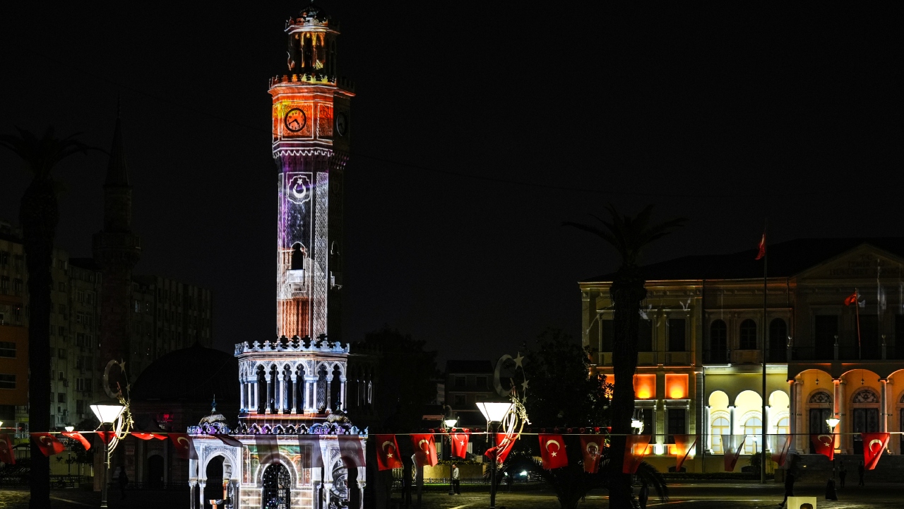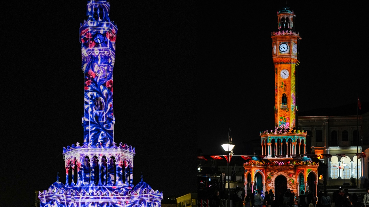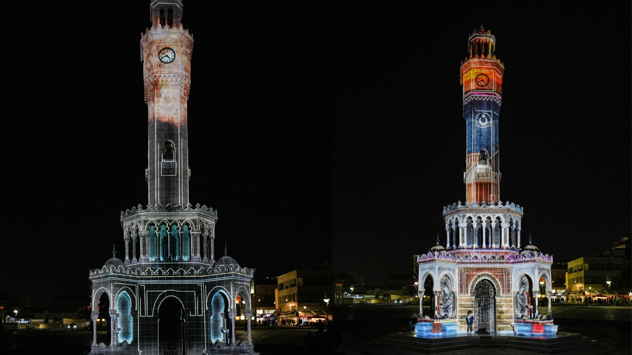 Konak Atatürk Meydanı'ndaki saat kulesine, zamanın akışını ve sonsuzluk temasını işleyen "Zamanın Hüneri" adlı dijital eser "mapping" tekniği kullanılarak yansıtıldı.