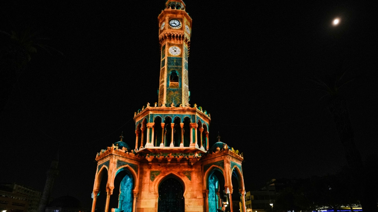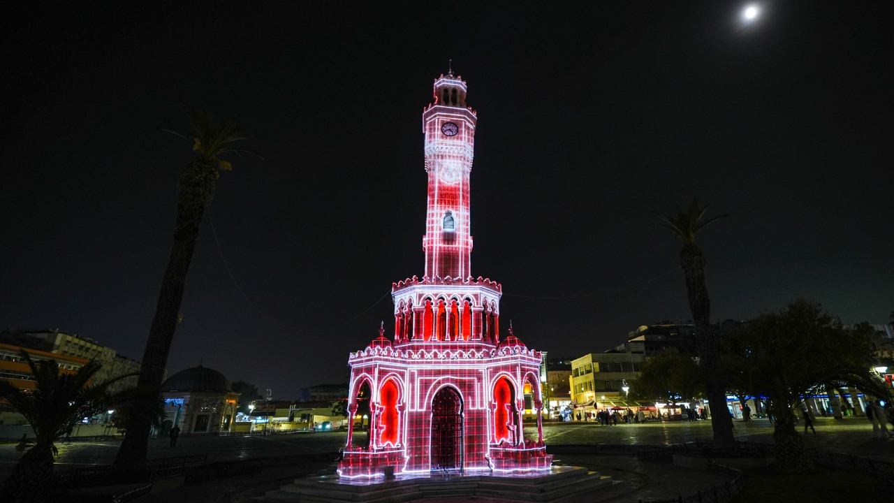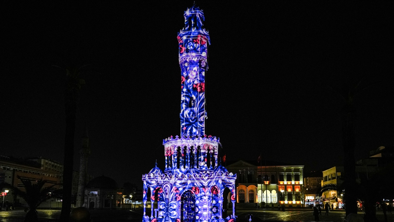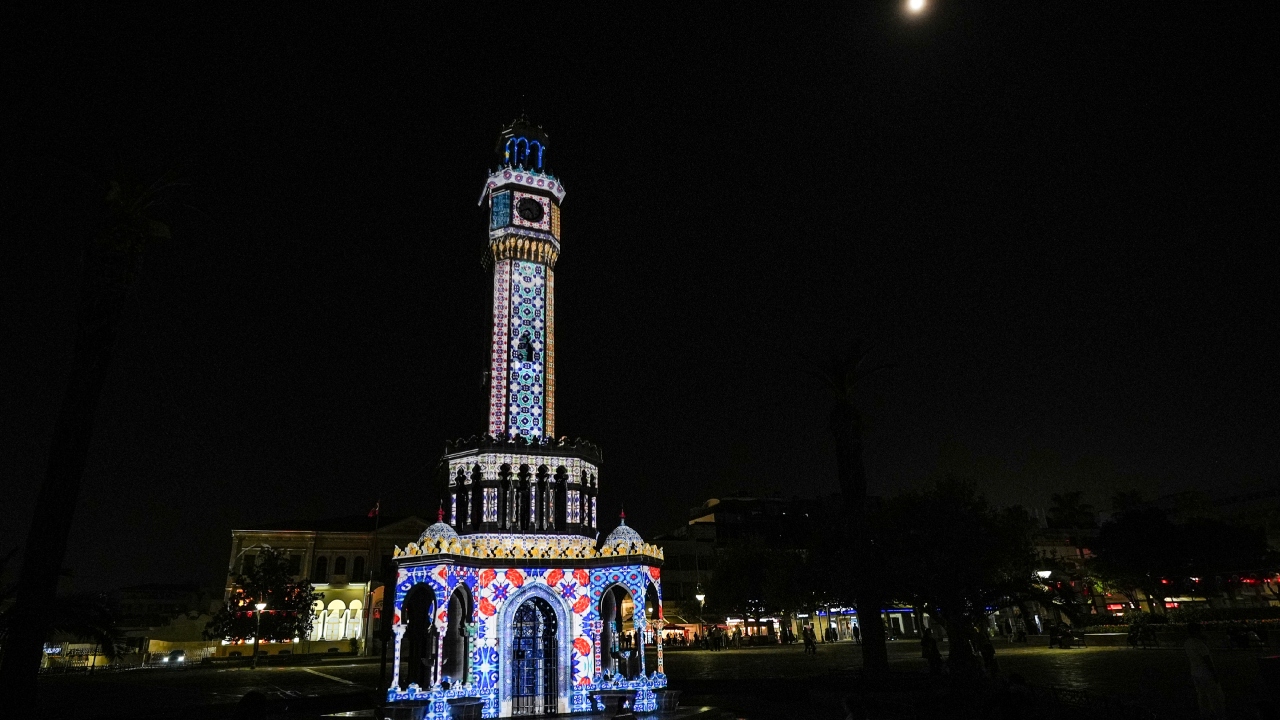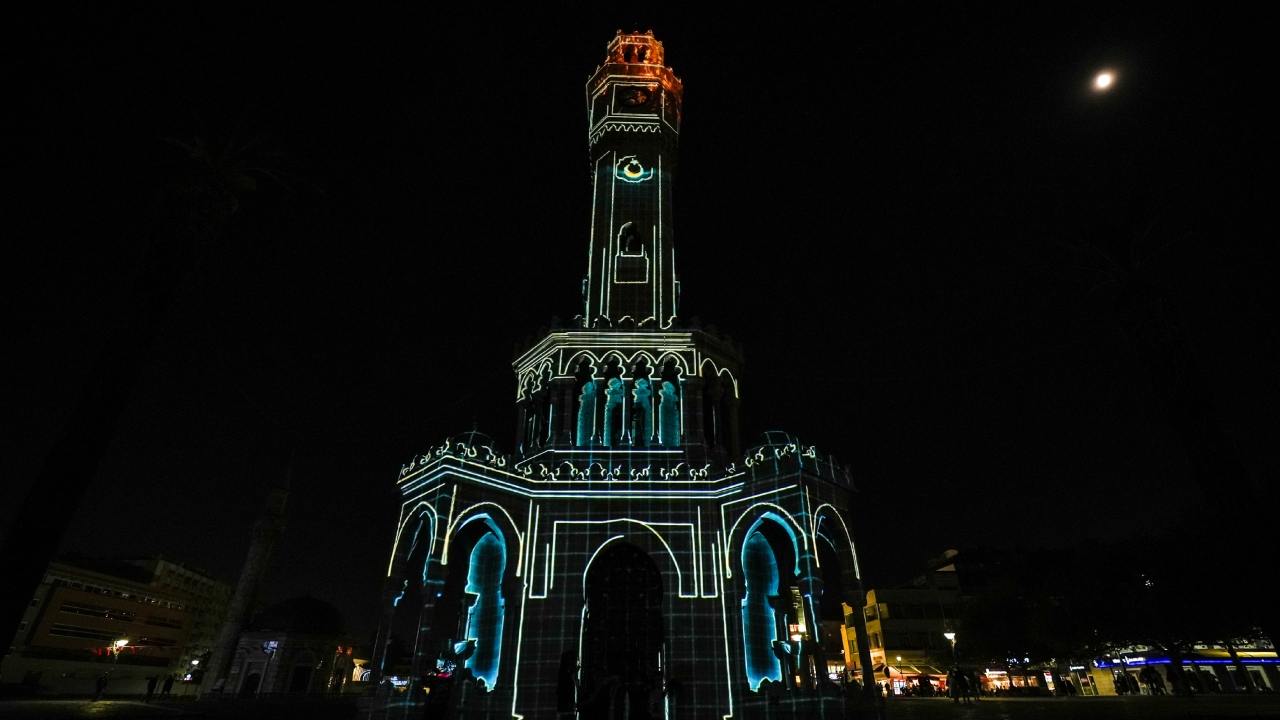 İzmir Kültür Yolu Festivali kapsamında kentin simgesel yapılarından İzmir Saat Kulesi, dijital sanat eseriyle ışıklandırıldı.