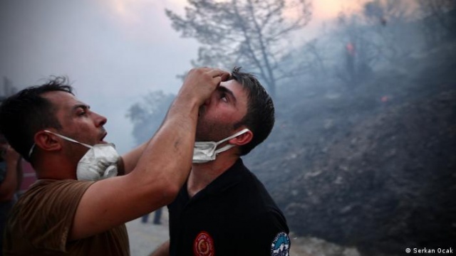 Bazı bölgelerde faciaya dönen yangından kimi zaman müdahale ekiplerini de etkileniyor... Gözleri yanan görevliler birbirine göz damlası damlatıyor.