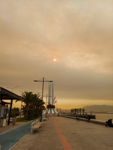 "Bugün, ilk saatlerden itibaren rüzgarların batı ve güneyli yönlere dönmesi ile ülkemizde ve Avrupa'da hafta boyunca ortaya çıkan orman yangınlarının oluşturduğu duman ve partikül madde kirleticiler ile Afrika üzerinden gelen toz taşınımı İzmir, Aydın, Manisa, Çanakkale ve Balıkesir'de etkili olmaktadır.