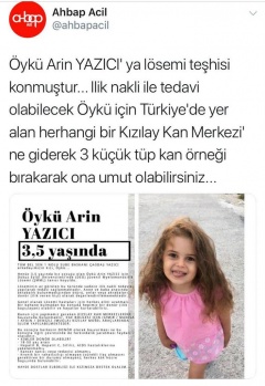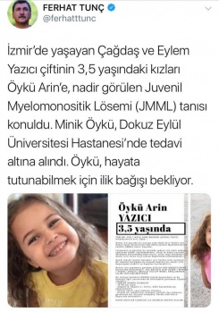 İzmirli Öykü Arin Yazıcı için Dokuz Eylül Üniversitesinde Juvenil Myelomonositik Lösemi (JMML)tanısı koyuldu.