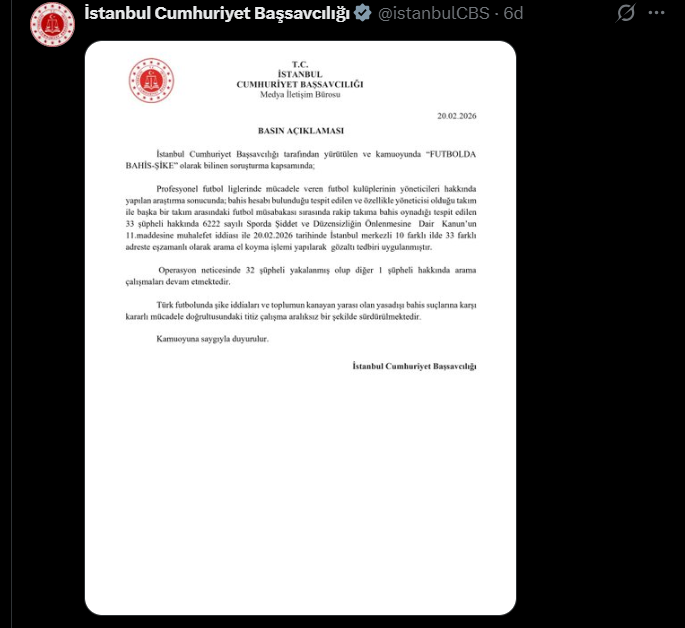 "İstanbul Cumhuriyet Başsavcılığı tarafından yürütülen ve kamuoyunda “FUTBOLDA BAHİS-ŞİKE” olarak bilinen soruşturma kapsamında, profesyonel futbol liglerinde mücadele veren futbol kulüplerinin yöneticileri hakkında yapılan araştırma sonucunda; bahis hesabı bulunduğu tespit edilen ve özellikle yöneticisi olduğu takım ile başka bir takım arasındaki futbol müsabakası sırasında rakip takıma bahis oynadığı tespit edilen 33 şüpheli hakkında 6222 sayılı SPORDA ŞİDDET VE DÜZENSİZLİĞİN ÖNLENMESİNE DAİR KANUN’un 11.maddesine muhalefet iddiası ile 20.02.2026 tarihinde İstanbul merkezli 10 farklı ilde 33 farklı adreste eşzamanlı olarak arama el koyma işlemi yapılarak gözaltı tedbiri uygulanmıştır. Operasyon neticesinde 32 şüpheli yakalanmış olup diğer 1 şüpheli hakkında arama çalışmaları devam etmektedir. Türk futbolunda şike iddiaları ve toplumun kanayan yarası olan yasadışı bahis suçlarına karşı kararlı mücadele doğrultusundaki titiz çalışma aralıksız bir şekilde sürdürülmektedir.