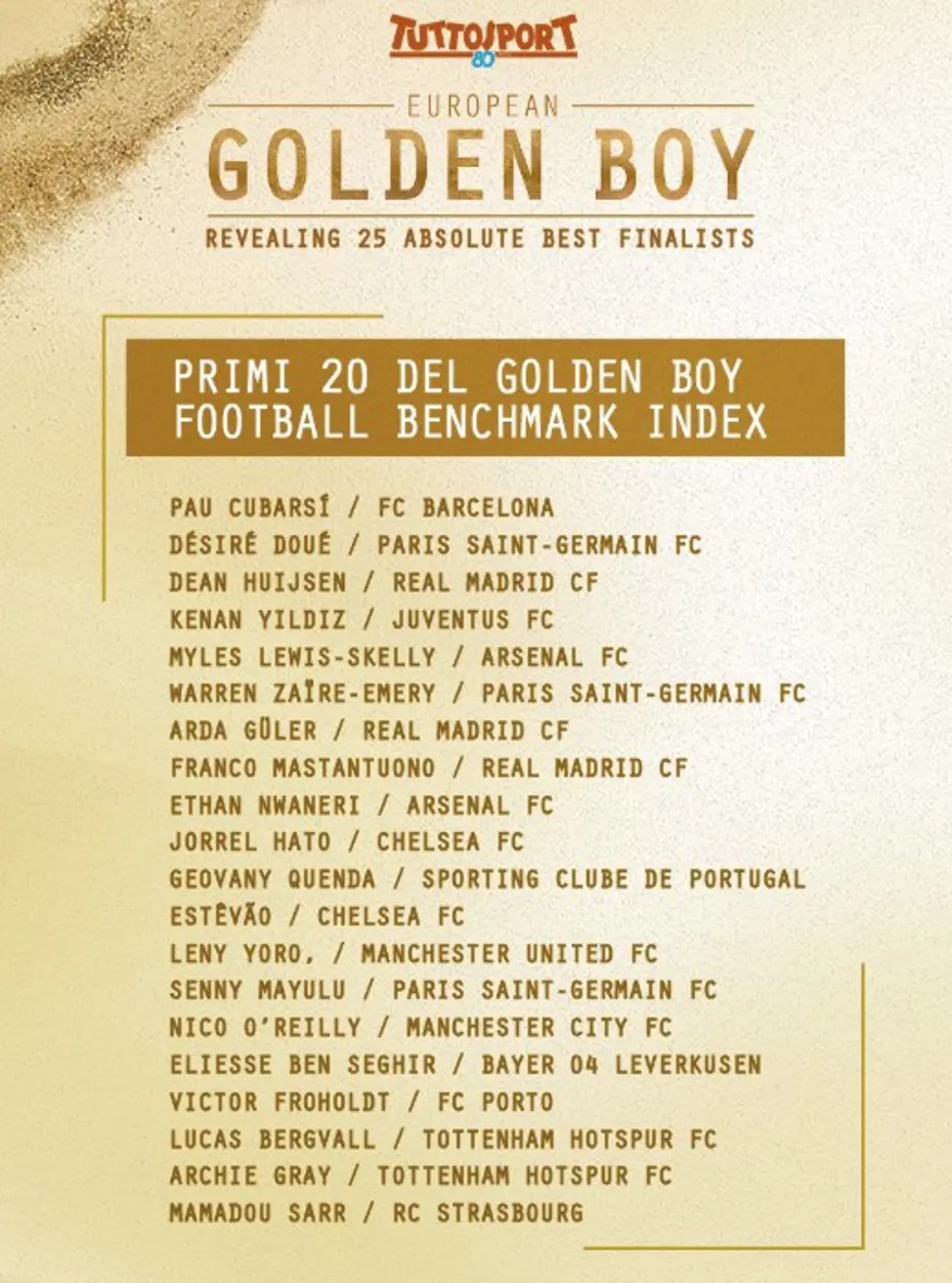 Tuttosport tarafından her yıl düzenlenen ve 21 yaş altı futbolcular arasında Avrupa'nın en iyisi futbolcusunu belirleyen Golden Boy’da Türkiye'yi iki büyük yetenek temsil edecek. Real Madrid'in genç yıldızı Arda Güler ve Juventus forması giyen 10 numara Kenan Yıldız, yılın en iyi 25 genç futbolcusu listesine isimlerini yazdırdı.