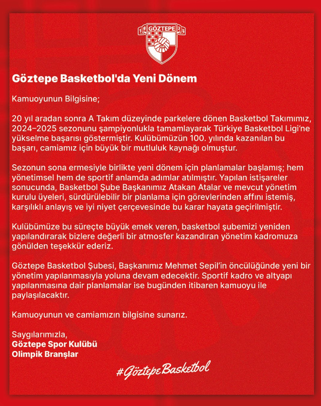 Göztepe Spor Kulübü tarafından yapılan açıklamada, Basketbol Şube Başkanı Atakan Atalar ve mevcut yönetim kurulu üyelerinin, sürdürülebilir bir planlama amacıyla görevlerinden affını istedikleri belirtildi. Kararın, karşılıklı anlayış ve iyi niyet çerçevesinde alındığı vurgulandı.