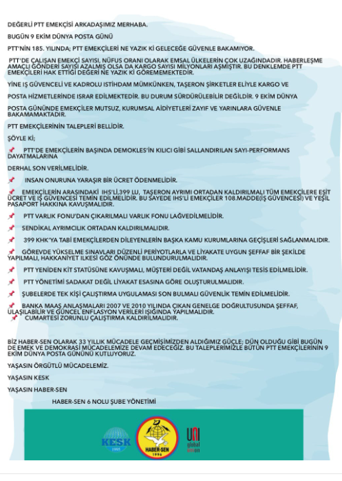 Biz Haber-Sen olarak 33 yıllık mücadele geçmişimizden aldığımız güçle; dün olduğu gibi bugün de emek ve demokrasi mücadelemize devam edeceğiz. Bu taleplerimizle bütün ptt emekçilerinin 9 ekim dünya posta gününü kutluyoruz.