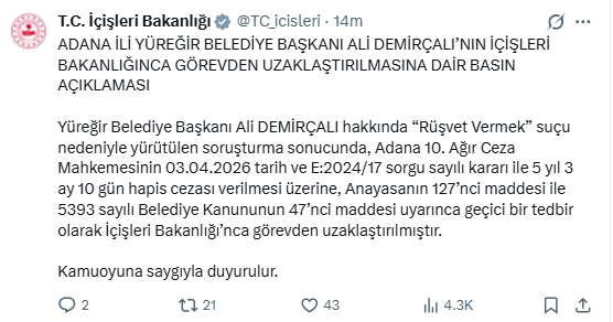 "Yüreğir Belediye Başkanı Demirçalı hakkında 'rüşvet vermek' suçu nedeniyle yürütülen soruşturma sonucunda, Adana 10. Ağır Ceza Mahkemesi'nin 3 Nisan 2026 tarih ve E:2024/17 sorgu sayılı kararı ile 5 yıl 3 ay 10 gün hapis cezası verilmesi üzerine, Anayasanın 127'nci maddesi ile 5393 sayılı Belediye Kanununun 47'nci maddesi uyarınca geçici bir tedbir olarak İçişleri Bakanlığı'nca görevden uzaklaştırılmıştır."
