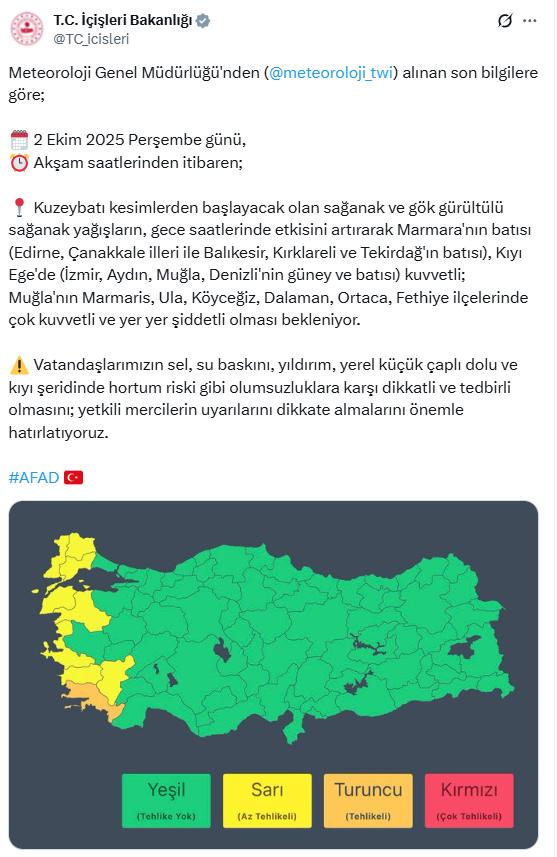 "Meteoroloji Genel Müdürlüğü'nden alınan son bilgilere göre; 2 Ekim 2025 Perşembe günü, Akşam saatlerinden itibaren; Kuzeybatı kesimlerden başlayacak olan sağanak ve gök gürültülü sağanak yağışların, gece saatlerinde etkisini artırarak Marmara'nın batısı (Edirne, Çanakkale illeri ile Balıkesir, Kırklareli ve Tekirdağ'ın batısı), Kıyı Ege'de (İzmir, Aydın, Muğla, Denizli'nin güney ve batısı) kuvvetli; Muğla'nın Marmaris, Ula, Köyceğiz, Dalaman, Ortaca, Fethiye ilçelerinde çok kuvvetli ve yer yer şiddetli olması bekleniyor.