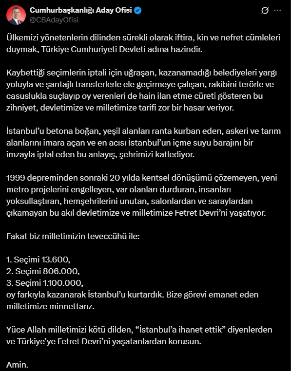 "Ülkemizi yönetenlerin dilinden sürekli olarak iftira, kin ve nefret cümleleri duymak, Türkiye Cumhuriyeti Devleti adına hazindir. Kaybettiği seçimlerin iptali için uğraşan, kazanamadığı belediyeleri yargı yoluyla ve şantajlı transferlerle ele geçirmeye çalışan, rakibini terörle ve casuslukla suçlayıp oy verenleri de hain ilan etme cüreti gösteren bu zihniyet, devletimize ve milletimize tarifi zor bir hasar veriyor. İstanbul’u betona boğan, yeşil alanları ranta kurban eden, askeri ve tarım alanlarını imara açan ve en acısı İstanbul’un içme suyu barajını bir imzayla iptal eden bu anlayış, şehrimizi katlediyor. 1999 depreminden sonraki 20 yılda kentsel dönüşümü çözemeyen, yeni metro projelerini engelleyen, var olanları durduran, insanları yoksullaştıran, hemşehrilerini unutan, salonlardan ve saraylardan çıkamayan bu akıl devletimize ve milletimize Fetret Devri’ni yaşatıyor. Fakat biz milletimizin teveccühü ile: 1. Seçimi 13.600, 2. Seçimi 806.000, 3. Seçimi 1.100.000, oy farkıyla kazanarak İstanbul’u kurtardık. Bize görevi emanet eden milletimize minnettarız. Yüce Allah milletimizi kötü dilden, “İstanbul’a ihanet ettik” diyenlerden ve Türkiye’ye Fetret Devri’ni yaşatanlardan korusun. Amin."