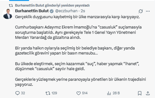 Tutuklu İBB Başkanı ve CHP'nin cumhurbaşkanı adayı Ekrem İmamoğlu'na 'casusluk' soruşturması başlatıldı. Aynı soruşturma kapsamında gazeteci Merdan Yanardağ da gözaltına alındı. CHP'li Burhanettin Bulut, "Bu ülkede eleştirmek, seçim kazanmak 'suç', haber yapmak 'ihanet', düşünmek 'casusluk' sayılır hale geldi" ifadelerini kullandı.