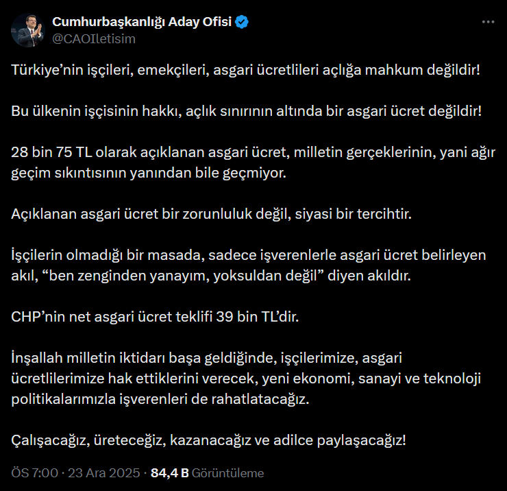 "Türkiye’nin işçileri, emekçileri, asgari ücretlileri açlığa mahkum değildir! Bu ülkenin işçisinin hakkı, açlık sınırının altında bir asgari ücret değildir! 28 bin 75 TL olarak açıklanan asgari ücret, milletin gerçeklerinin, yani ağır geçim sıkıntısının yanından bile geçmiyor. Açıklanan asgari ücret bir zorunluluk değil, siyasi bir tercihtir. İşçilerin olmadığı bir masada, sadece işverenlerle asgari ücret belirleyen akıl, “ben zenginden yanayım, yoksuldan değil” diyen akıldır. CHP’nin net asgari ücret teklifi 39 bin TL’dir. İnşallah milletin iktidarı başa geldiğinde, işçilerimize, asgari ücretlilerimize hak ettiklerini verecek, yeni ekonomi, sanayi ve teknoloji politikalarımızla işverenleri de rahatlatacağız. Çalışacağız, üreteceğiz, kazanacağız ve adilce paylaşacağız!"