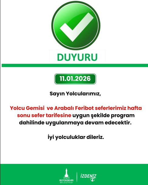 Bu gelişmelerin ardından gözler bugüne çevrildi. 11 Ocak 2026 sabah saatlerinde İZDENİZ’in resmi sosyal medya hesabından yeni bir duyuru paylaşıldı. Yapılan açıklamada yolcu gemisi ve arabalı feribot seferlerinin hafta sonu sefer tarifesine uygun şekilde program dahilinde uygulanmaya devam edeceği bildirildi. İZDENİZ’in bugünkü duyurusunda şu ifadelere yer verildi: “Sayın Yolcularımız, Yolcu Gemisi ve Arabalı Feribot seferlerimiz hafta sonu sefer tarifesine uygun şekilde program dahilinde uygulanmaya devam edecektir. İyi yolculuklar dileriz.”