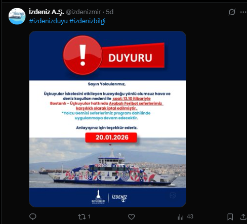 İZDENİZ tarafından yapılan açıklamada kuzeydoğu yönlü olumsuz hava ve deniz koşullarının Üçkuyular İskelesi üzerinde etkili olduğu belirtildi. Bu kapsamda saat 13.10 itibarıyla Bostanlı–Üçkuyular hattında hizmet veren arabalı feribot seferlerinin karşılıklı olarak iptal edildiği bildirildi.