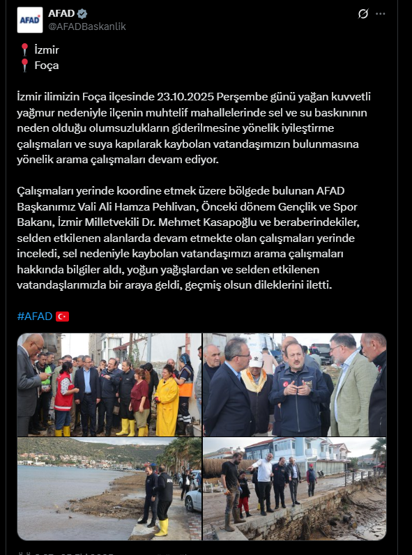 Afet ve Acil Durum Yönetimi Başkanlığı (AFAD) sosyal medya hesabı üzerinden Foça’daki son durumu şöyle paylaştı: "İzmir ilimizin Foça ilçesinde 23.10.2025 Perşembe günü yağan kuvvetli yağmur nedeniyle ilçenin muhtelif mahallelerinde sel ve su baskınının neden olduğu olumsuzlukların giderilmesine yönelik iyileştirme çalışmaları ve suya kapılarak kaybolan vatandaşımızın bulunmasına yönelik arama çalışmaları devam ediyor."