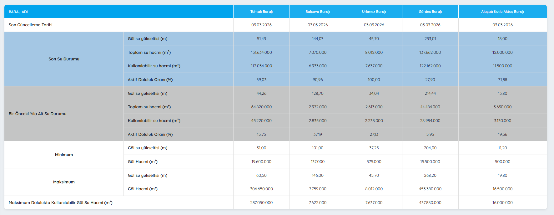 ÜRKMEZ BARAJI GÜNCEL DOLULUK ORANLARI