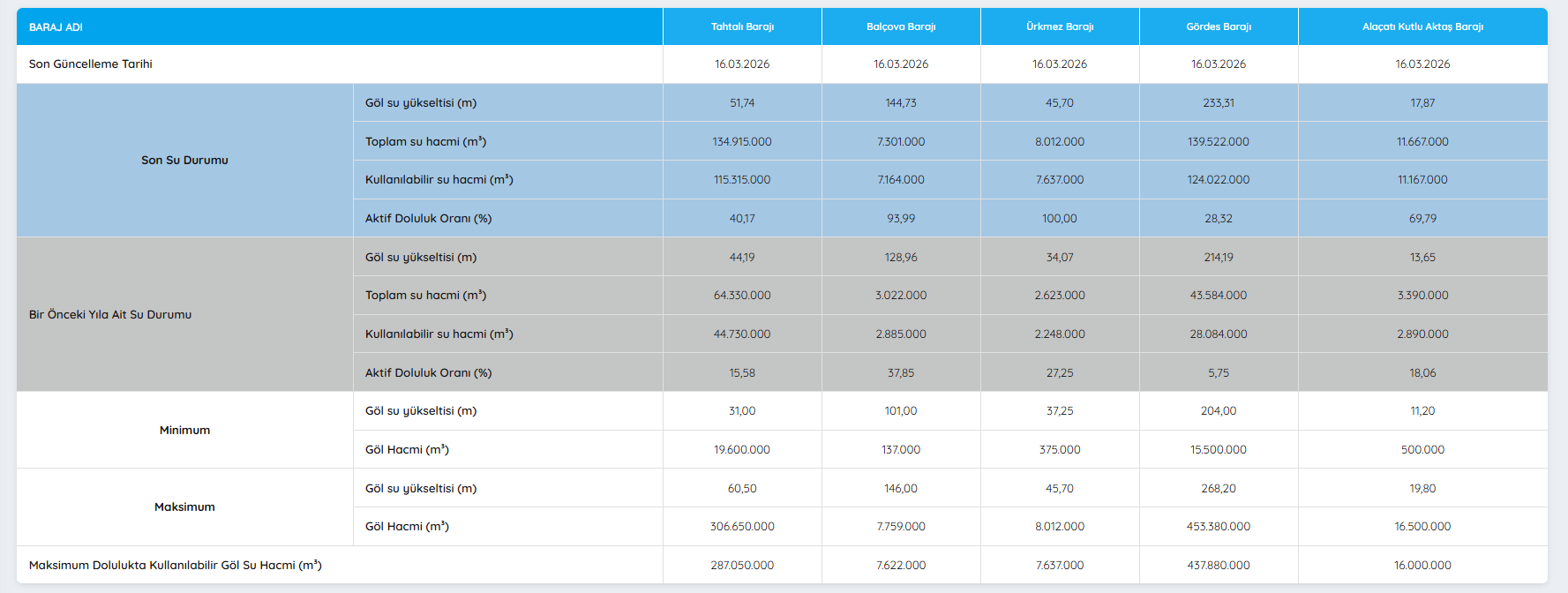 İzmir’de uzun süre kritik düzeylerde seyreden baraj dolulukları geçtiğimiz haftalarda etkili olan yağışlarla yükseldi. İzmir Su ve Kanalizasyon İdaresi (İZSU), İzmir barajlarının güncel doluluk oranlarını kamuoyuyla paylaştı. 16 Mart 2026 tarihi itibariyle işte İzmir barajlarındaki güncel veriler...
