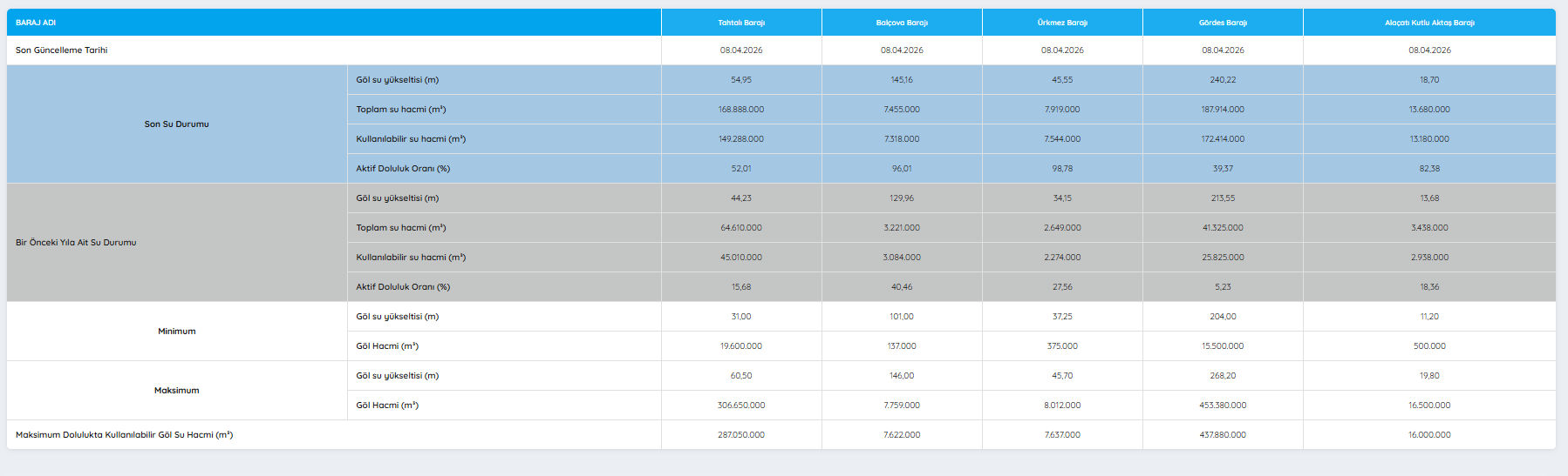 İzmir’de son günlerde etkili olan yağışların ardından baraj doluluk oranları yeniden gündeme geldi. İzmir Su ve Kanalizasyon İdaresi (İZSU), 8 Nisan 2026 tarihi itibarıyla İzmir'deki barajların güncel doluluk oranlarını paylaştı. İZSU tarafından açıklanan verilere göre birçok barajda geçen yılın aynı dönemine kıyasla belirgin artış yaşandı. İşte İzmir'deki barajlarda son durum...