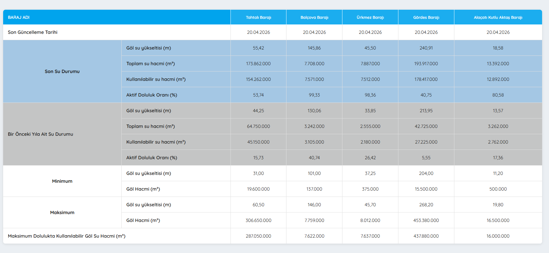 İzmir Su ve Kanalizasyon İdaresi (İZSU) tarafından paylaşılan 20 Nisan 2026 tarihli veriler İzmir genelindeki birçok barajın geçen yılın aynı dönemine göre belirgin artış yaşadığını ortaya koydu. İşte İzmir'deki barajlarda son durum...