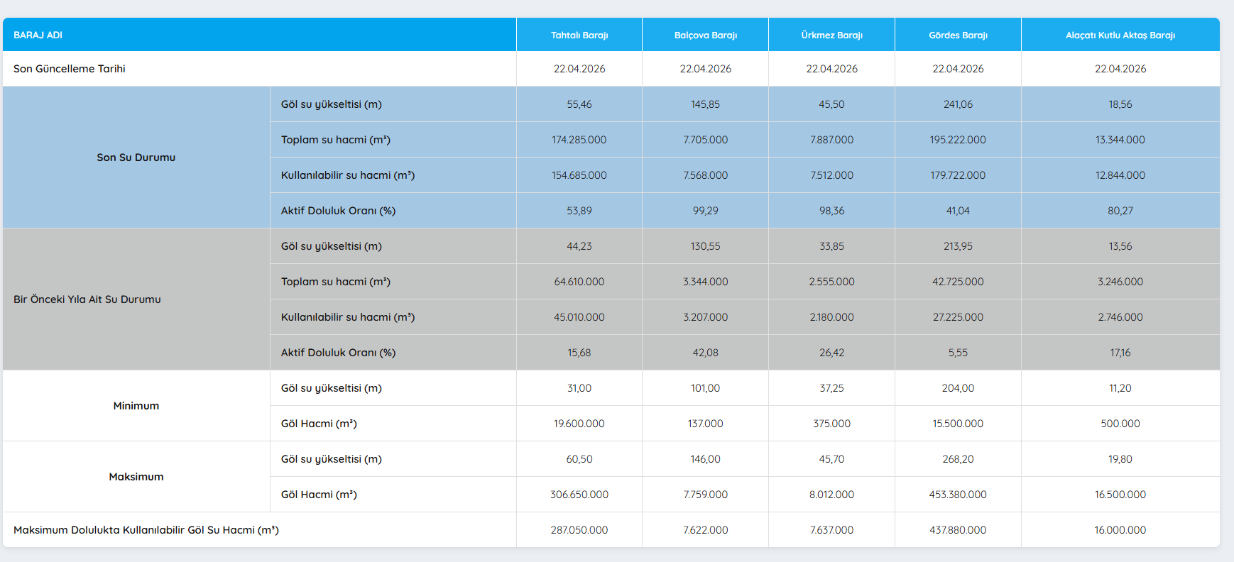 23 Nisan 2026 itibarıyla İzmir’de aralıklı yağış etkisini sürdürse de baraj doluluk oranlarına ilişkin en güncel resmi veriler İZSU tarafından 22 Nisan 2026 tarihinde paylaşıldı. Ancak açıklanan rakamlar ortalama olarak İzmir’de su kaynaklarının geçen yıla kıyasla önemli ölçüde toparlandığını ortaya koydu.