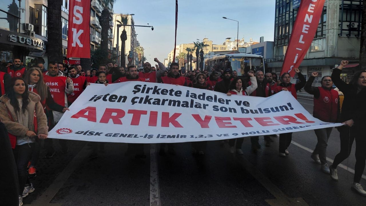 İzmir Büyükşehir Belediyesi’nde çalışanlar, ödenmeyen yan haklar ve fazla mesai alacakları ile toplu işten çıkarmalara karşı mücadeleye devam ediyor. DİSK Genel-İş Sendikası İzmir 1, 2, 3 ve 9 No’lu şubelerde örgütlü binlerce İZBB emekçisi, “Çıplak maaşa çıplak ayakla yürüyoruz” eylemlerine başlamıştı.