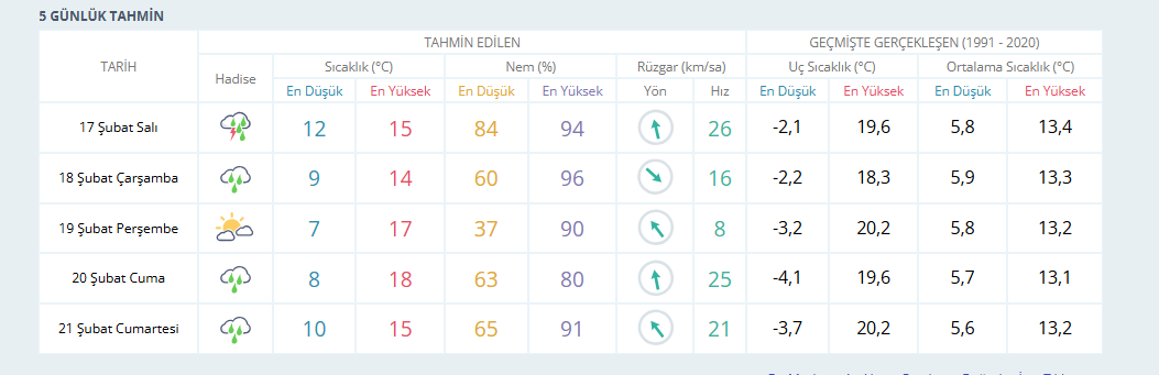İzmir için yayımlanan tahminlere göre 17 Şubat Salı günü gök gürültülü sağanak yağış etkili olacak. Gün içinde hava sıcaklığının yaklaşık 15 derece civarında seyretmesi bekleniyor. Hafta ortasında da yağışların etkisini sürdürmesi öngörülüyor. 18 Şubat Çarşamba günü sağanak yağışla birlikte sıcaklığın 14 dereceye düşmesi beklenirken 19 Şubat Perşembe günü parçalı bulutlu bir hava ve 17 derece civarında sıcaklık tahmin ediliyor. 20 Şubat Cuma günü sağanak yağışların yeniden etkili olması ve sıcaklığın 18 dereceye yükselmesi beklenirken 21 Şubat Cumartesi günü ise sağanak yağışlı havayla birlikte sıcaklığın 15 derece civarında seyretmesi öngörülüyor.